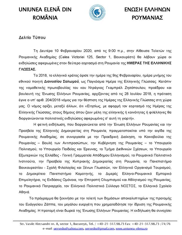 COMUNICAT DE PRESĂ ZIUA LIMBII ELENE, 10 februarie 2020, Aula Academiei Române